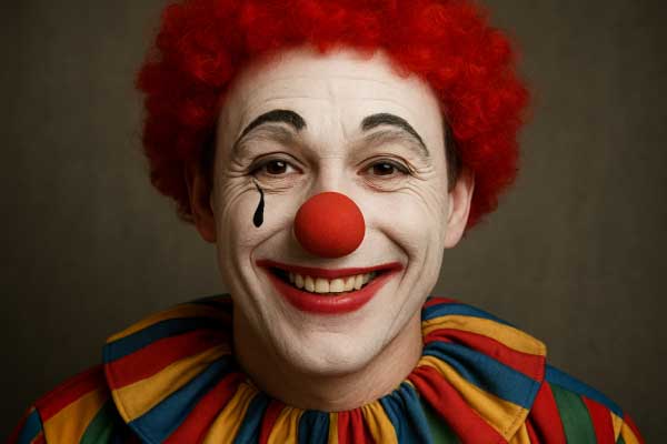 サーカスでピエロがバナナの皮を踏んで滑って転ぶシーンがあります。それを観客からの遠目で見るとオモシロい喜劇ですが、実際に滑って転んでいる当人にとっては、痛いし惨めだし、悲劇以外の何物でもありません。ピエロは、目の下に涙が一滴落ちるメイクをしています。それは、人を笑わせる演技をしていても心の底では泣いていることを表現しているのです。