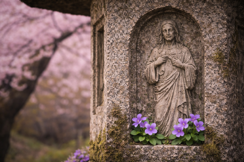 次に描かれるのは、すみれの下にある燈籠に刻まれた立像。
