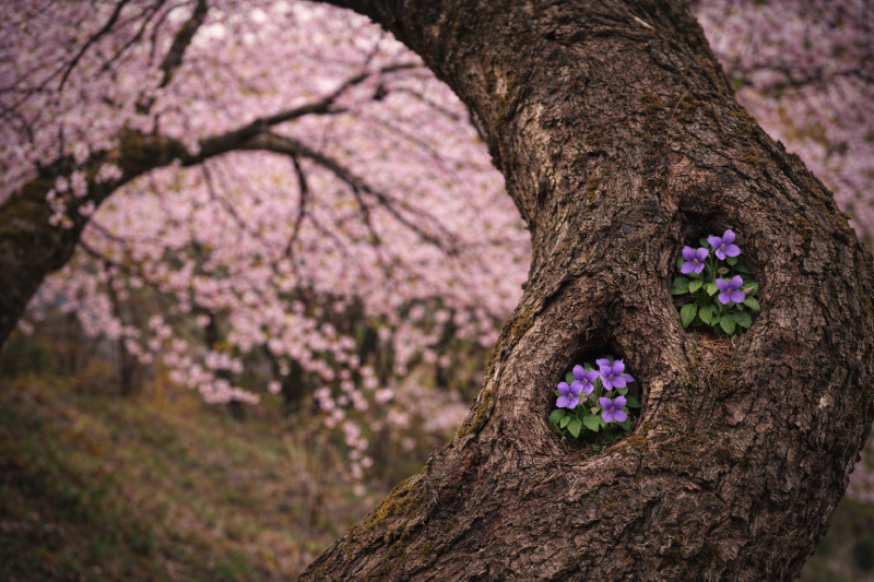 大きく曲がる少し下のあたり、幹に小さいくぼみが二つあるらしく、そのくぼみそれぞれに、すみれが生えているのだ。そして春ごとに花をつけるのだ。千重子がものごころつく頃から、この樹上ふた株のすみれはあった。